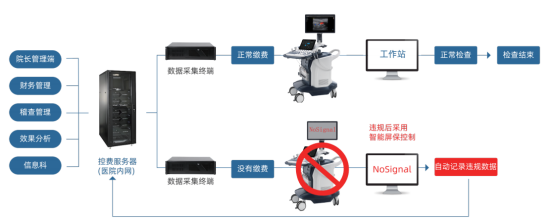 医疗设备智能控费系统通过计算机网络技术和智能传感技术和嵌入系统等高科技技术于一身,分析患者检查过程中,医疗设备的内部的影像数据结合医疗设备运行状态,来识别人次、检查部位等信息,系统可详细记录医疗设备的使用信息(每次检查的操作人员、所使用的设备、操作时间、检查人次、每次检查的耗时、患者ID号等)。有效的解决了医院现实存在的少收、漏收、人情费问题,有效的完善了医院监督管理。