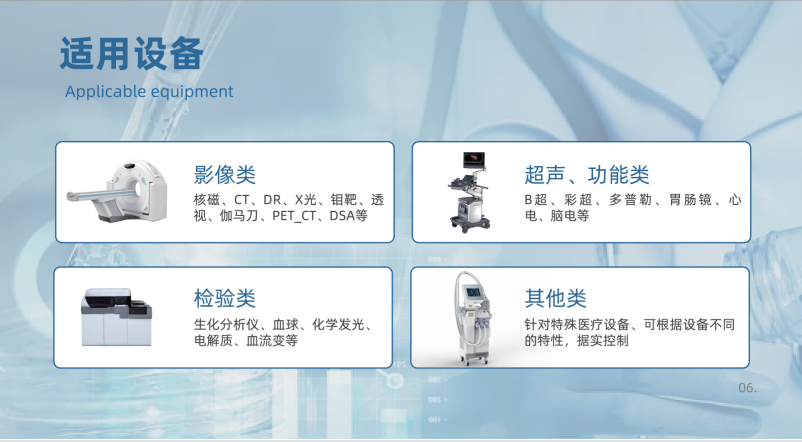 主要用于医院医技科室设备监控与管理,例如放射科、超声科、检验科、内镜科等科室的各类医技辅助检查设备的实时监控与数据分析,防止漏费情况的发生。